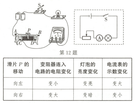 12. 根据“滑动变阻器改变电路中的电流”的实验,回答下列问题。