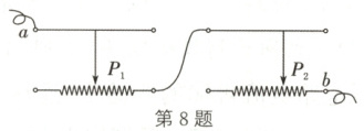8. 如图所示,将两个滑动变阻器串联起来,将a、b两接线柱接入电路后,若要使这两个滑动变阻器总电阻最大,则滑片P₁、P₂所处的位置应是(