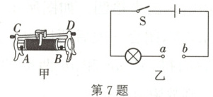 7. (2024·吕梁汾阳期中)如图甲所示的滑动变阻器接在图乙电路的a、b两点间,组成一个调光电路。滑片P向右移动过程中,灯的亮度变暗,应将接线柱(