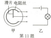 11. (2024·吕梁交城期中)小明家有一个台灯可以调节亮度,图甲为台灯的电位器示意图,等小明逆时针旋转旋钮(滑片)时,灯泡变亮,请你帮小明把该电位器连入图乙。