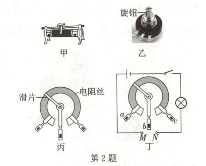 (2)学习完“练习使用滑动变阻器”后,该同学从网上买了一个合适规格的电位器,准备制作一个简易的调光台灯。如图丁所示,该电位器的滑片只能在a、c间的电阻丝上滑动,若要使旋钮逆时针转动时台灯变暗,则应将电位器的