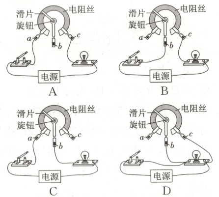 1. (2024·山西期中)中学生近视的一大因素就是在光线太弱或太强的环境中学习,为保护视力,预防近视,小明用旧家电拆下的电位器设计了一款亮度可调的台灯,当沿顺时针方向调节旋钮可以使灯泡变亮,下列方案符合要求的是(