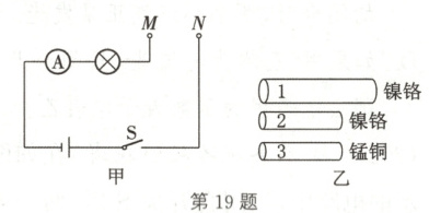 19. (2024·晋中寿阳期中)同学们利用如图甲所示的电路探究“影响电阻大小的因素”,其中1、2、3电阻丝材料如图乙所示,电阻丝2、3长度相同、粗细相同,电阻丝1长度最长、横截面积最大。下列说法中正确的是(