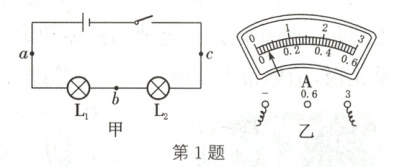 1. 某物理研究小组进行电学实验,在“探究串联电路的电流特点”的实验中,小周同学选用两个不同的灯泡设计了如图甲所示的串联电路,用一个电流表分别接在$a$、$b$、$c$三处去测量电流。