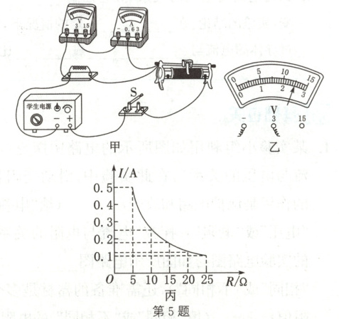 5. 创新学习小组用如图甲所示电路“探究电流与电阻的关系”。电源电压恒定不变,滑动变阻器上标有“20Ω 2A”字样,阻值分别为5Ω、10Ω、15Ω、20Ω、25Ω的定值电阻各一个。