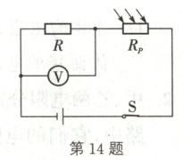 14. 如图所示为一款摄像机自主启动装置的简化电路图,电源电压恒为$12V$,$R_{P}$是红外线探测电阻,$R$是定值电阻,阻值为$8\Omega$。当$R$两端的电压达到$8V$时,摄像机自主启动拍摄,求此时: