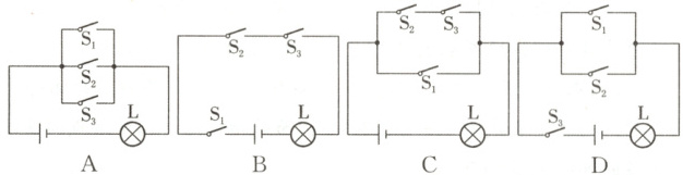 8. 常用智能手机是通过指纹开关 S₁ 或密码开关 S₂ 来解锁的,若其中任何一种方式解锁失败后,锁定开关 S₃ 均会断开而暂停手机解锁功能,开关 S₃ 将在一段时间后自动闭合从而恢复解锁功能。若用灯泡 L 发光模拟手机解锁成功,则下列符合要求的模拟电路图是(