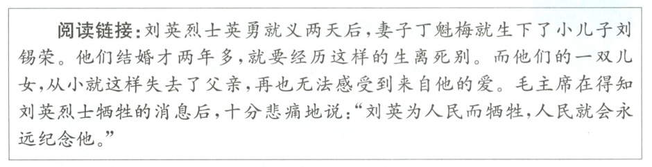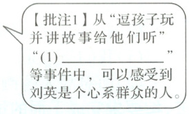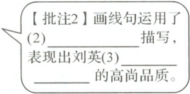 (3)忠于革命(或:热爱祖国、不怕牺牲等) [解析]本题考查文章内容理解。第一处批注,由文中“当孩子们烂脚又无钱医治时,他帮助治疗,还给孩子们买了漂亮的鞋子”可概括为:帮孩子们治疗烂脚并买鞋。第二处批注,画线句是引用了刘英说的话,属于语言描写,表现了他热爱祖国、不怕牺牲的精神。