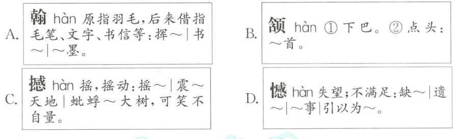 (2)C 【解析】本题考查字义的辨析。A项,“翰”与羽毛、文字等有关,与“动”不匹配。B项,“颔”指下巴或点头,不符合语境。C项,“撼”意为摇动,符合词义。D项,“憾”表失望、不满足,不符合语境。故选C。