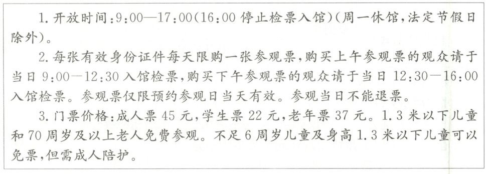 (1)小题,由“开放时间:9:00—17:00”“周一休馆,法定节假日除外”可知国庆期间的周一早上9:30科技馆开门,故本题说法错误。第