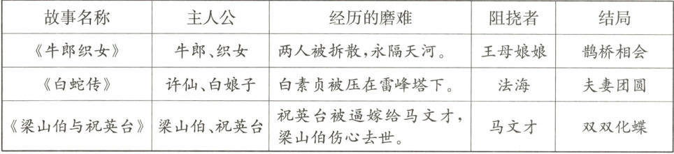①民间故事主人公都有一男一女;②民间故事都有阻挠者;③民间故事往往过程曲折,但结局大多是美好的。(写出两点即可)