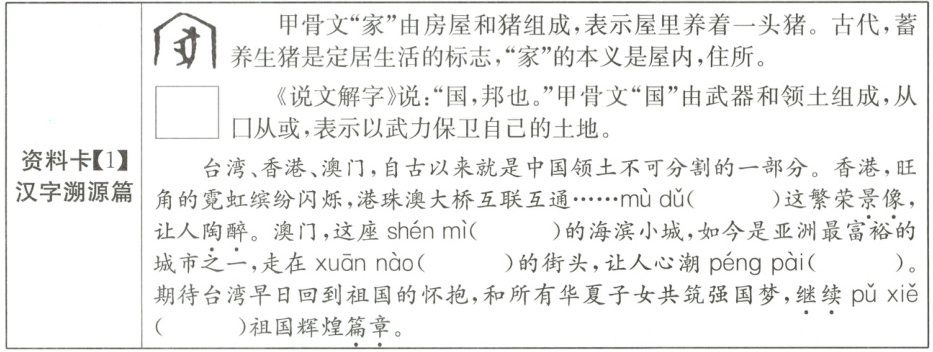 1.略 2.目睹 神秘 喧闹 澎湃谱写 【点评】本题考查在具体语境中看拼音写词语的能力。要认真拼读给出的拼音,明确要写的汉字,写完后再次检查拼写是否正确。书写时注意字的笔画和笔顺,做到工整、规范、正确。本题“秘”“澎湃”“谱”的笔画较复杂,易写错,需注意。 3.A 【解析】本题考查字形的辨析。A项“景像”应为“景象”。 4.D 【解析】本题考查汉字造字法及演变。根据资料卡【1】“甲骨文‘国’由武器和领土组成,从口从或”可知,D项古汉字最符合。
