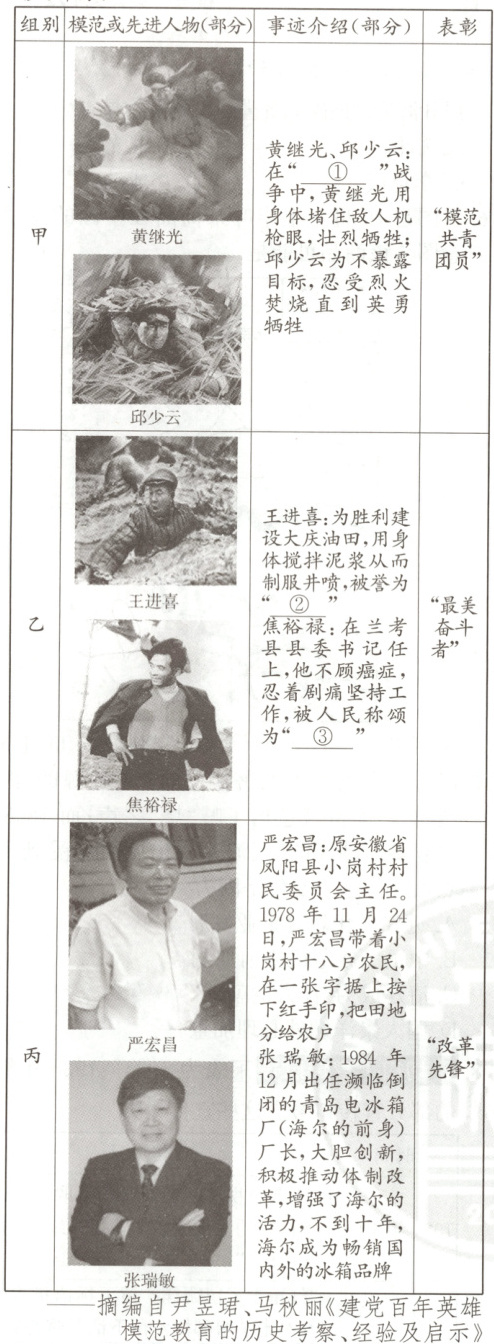 (1)①:抗美援朝;②:铁人;③:党的好干部。(3分)标准:甲组,战斗英雄;(1分)乙组,为国家作出贡献的人。(1分)