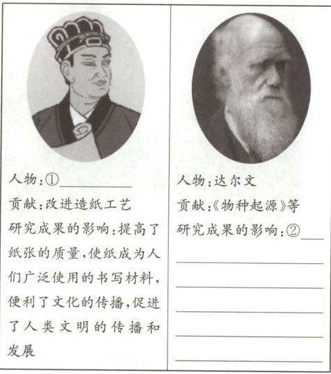 (1)①蔡伦。(1分)②打破了千百年来“上帝创造万物”的神创论,在生物科学领域掀起了一场伟大革命。(1分)
