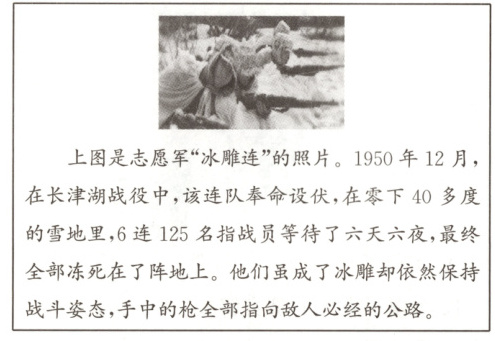 (2)根据材料二并结合所学知识,分析“冰雕连”体现的革命精神及其反映的战争的胜利对新中国的意义。(5分)