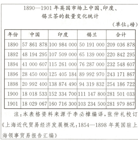 (2)根据材料二,概括1890—1901年英国市场上中国茶的数量变化。并归纳针对这一变化,甲午中日战争后晚清政府采取的措施。(6分)