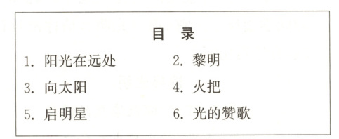 2. (1)示例一:我选A。目录中的诗歌都围绕“太阳”“火把”“星光”等意象,表达追求光明、驱逐黑暗、坚持斗争、争取胜利的美好愿望。“追光千里”符合诗集的主旨。 示例二:我选B。目录中的诗歌都围绕“太阳”“火把”“星光”等意象,充满象征意味,表达了诗人对理想的执着,希望和理想就是诗人心中永不磨灭的那束光。“理想不灭”符合诗集的主旨。 (2)① 低沉阴郁(或:愁苦忧郁) ② 重读“阳光”,语调上扬,读出对光明的追求与向往 (3)示例:如果我,可以/托举太阳的初升/我愿,献出/胸中那颗热烈心脏/温暖整个生命旅程