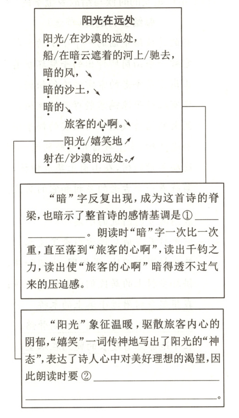 (2)“感情是朗诵的生命”,为更好地品读诗歌,小王同学为《阳光在远处》设计了朗读脚本,请你帮他完善设计说明。