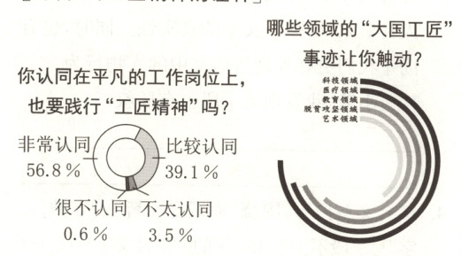 5. (1)示例:绝大部分的受访者表示,在平凡的工作岗位上也要践行“工匠精神”。(2分)受访者对科技、医疗、教育等领域的“大国工匠”事迹更有触动。(2分) (2)示例:在火箭发动机上灌装“火药”,是在刀尖上跳舞,却是千钧所系。(2分)30多年来一丝不苟,用生命中的一笔一画,雕刻出的是大国重器,也是新时代中国的战略自信。(2分) (3)示例:中国自古就是一个具有创新传统和工匠精神的国度。(2分)小到一颗螺丝钉、一块智能芯片,大到卫星、高铁、航母,它们背后都离不开新时代劳动者身体力行的工匠精神。(2分)老子曰:“天下大事,必作于细。”当代青少年也应积极弘扬和践行工匠精神,尊重所待之人和物,耐心细致地对待每件所行之事,把“匠心”融入学习、工作中的每一个环节,为民族的复兴贡献自己的青春力量。(2分)