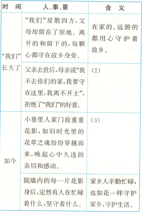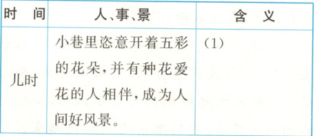 4. 文章题目《小巷有花守流年》意蕴丰富。为此,同学们用表格的形式进行梳理探究,请完成下面表格。(6分)