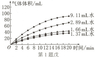 往锥形瓶中加入一定量的过碳酸钠、0.2gMnO2,再分别用不同体积的水进行实验。记录并处理20min内数据如图戊。