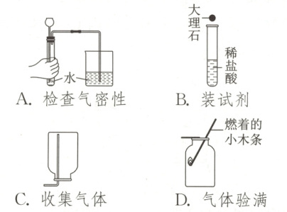 3. (2025·吕梁兴县段考)实验室制二氧化碳有以下操作:① 向锥形瓶中加入大理石;② 向长颈漏斗中注入稀盐酸;③ 固定装置;④ 检查装置气密性;⑤ 收集气体并验满二氧化碳。正确的操作顺序是(
