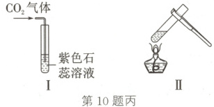 (填字母)。某同学在实验室制取二氧化碳时,还进行了如图丙所示的性质验证实验。实验Ⅰ的试管中发生反应的化学方程式为CO₂ + H₂O══H₂CO₃