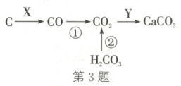3. A 解析:碳和氧气不充分燃烧生成一氧化碳,碳与二氧化碳在高温条件下反应生成一氧化碳,A正确;二氧化碳与氢氧化钙反应生成碳酸钙沉淀和水,Y可以是Ca(OH)$_2$,B错误;反应①是一氧化碳转化为二氧化碳,反应中一氧化碳得到氧发生氧化反应,C错误;反应②中碳酸分解生成水和二氧化碳,在此过程中氧元素化合价始终是-2,D错误。