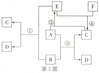 5. A~F 是初中化学常见的物质,有如图转化关系(反应条件已略去)。C、E、F 都是气体,其中 E 有毒;A、B 都是黑色固体,D 为红色固体。回答下列问题: