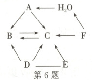 6. A、B、C、D、E、F 是初中化学常见的物质,其中 B、C 为元素组成相同的气体,D、E 为黑色固体,F 是大理石的主要成分,它们之间的转化关系如图所示(“→”表示一步转化关系,“—”表示能相互发生反应,部分反应物、生成物和反应条件均已略去)。