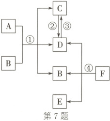 7. (2024·晋中模拟)A~F 是目前我们已学的几种常见的物质,它们有如图所示的转化关系(部分化学反应的反应条件、反应物、生成物未给出)。已知:A、C 在常温下均为液体,且含有相同的两种元素;D 是一种气体。回答下列问题: