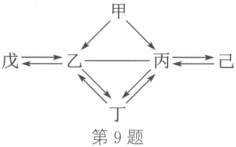 9. 如图所示物质及变化均是初中化学常见的纯净物及反应。乙、丙、丁对维持自然界生命活动至关重要(图中“→”表示两种物质间的转化关系;“—”表示相连物质能发生化学反应;部分反应物、生成物及反应条件已略去)。