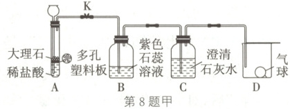 9. 化学兴趣小组同学在老师的指导下设计了如图甲装置并进行二氧化碳的制取和性质探究,请回答有关问题。