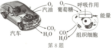 8. 汽车的开动和人的生命活动都需要能量,给它们提供能量的两个过程如图所示,下列分析错误的是(