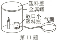 11. 如图为模拟可燃粉尘爆炸装置,先在小塑料瓶中放入干燥的面粉,点燃蜡烛,然后用气囊向装置中快速鼓入大量空气,使面粉充满罐体,可观察到爆炸现象(人与该装置保持安全距离),下列说法错误的是(