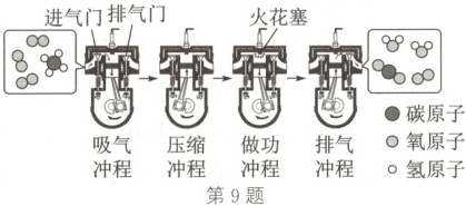 9. (跨学科实践)四冲程汽油机的工作冲程由吸气、压缩、做功、排气四个冲程组成,燃料为汽油、天然气等。气缸中部分微观粒子变化如图: