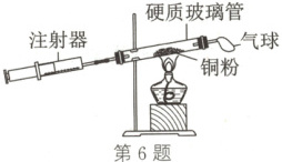 6. (创新实验)为了测定空气中氧气的含量,采用了如图装置进行实验:实验前气球被压瘪,内无气体,硬质玻璃管容积为75.0 mL,注射器活塞前端停留在25.0 mL刻度线处。加热铜粉(足量),同时反复推、拉注射器活塞,停止加热后,待玻璃管冷却至室温,将气球内的残余气体全部挤出,待注射器活塞稳定后,活塞前端停在3.0 mL刻度线处。下列说法错误的是(已知:铜和氧气在加热的条件下反应生成氧化铜固体)(