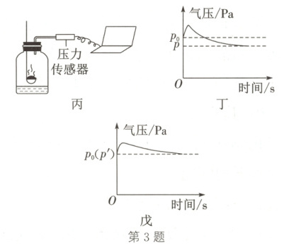 (6)用图丙装置测定空气中氧气的含量。图丁和图戊分别是红磷和木炭在装置内燃烧过程中装置内的气压随时间变化的关系图(装置气密性良好,$p_0$表示装置内起始气压,木炭在空气中燃烧生成二氧化碳气体)。