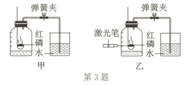 3.(创新考法)某化学兴趣小组的同学们设计了测定空气中氧气含量的实验,实验装置如图甲所示。实验步骤如下:① 检查装置气密性;② 在图甲中集气瓶内加入少量水,并将水面上方空间分为5等份;③ 在燃烧匙内装入足量的红磷,将乳胶管上的弹簧夹夹紧,在酒精灯上点燃红磷,并立即伸入集气瓶内,塞紧橡胶塞;④ 充分反应后,待集气瓶冷