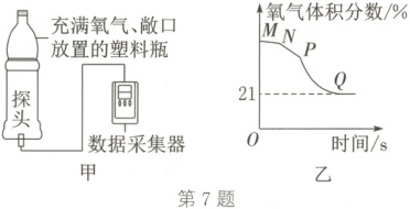 7. (创新考法)“数字化”赋能化学实验。借助氧气传感器探究微观粒子的运动(图甲),用软件实时绘出氧气体积分数随时间变化的曲线(图乙)。现收集一塑料瓶氧气进行以下三步实验:① 敞口放置;② 双手贴在塑料瓶外壁上;③ 将塑料瓶的瓶口朝下。三步实验中,测得氧气的体积分数随时间变化的曲线依次为图乙中的MN段、NP段和PQ段。下列说法错误的是(