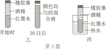 (2)改进实验:先在一支试管中装一半红墨水,再在液面上方注满酒精(缓缓注入),旋紧橡胶塞密封后静置,30日后观察,前后现象如图乙所示。小明做的实验还可以说明的分子性质是
