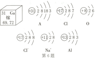 6. 镓元素在元素周期表的信息以及部分微观粒子结构示意图如图所示。根据图中信息,回答下列问题: