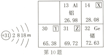 10. (社会热点)“芯片”是电子产品的核心部件,氮化镓是制造芯片的材料之一,如图是镓元素(Ga)的原子结构示意图及元素周期表的一部分。下列说法错误的是 (