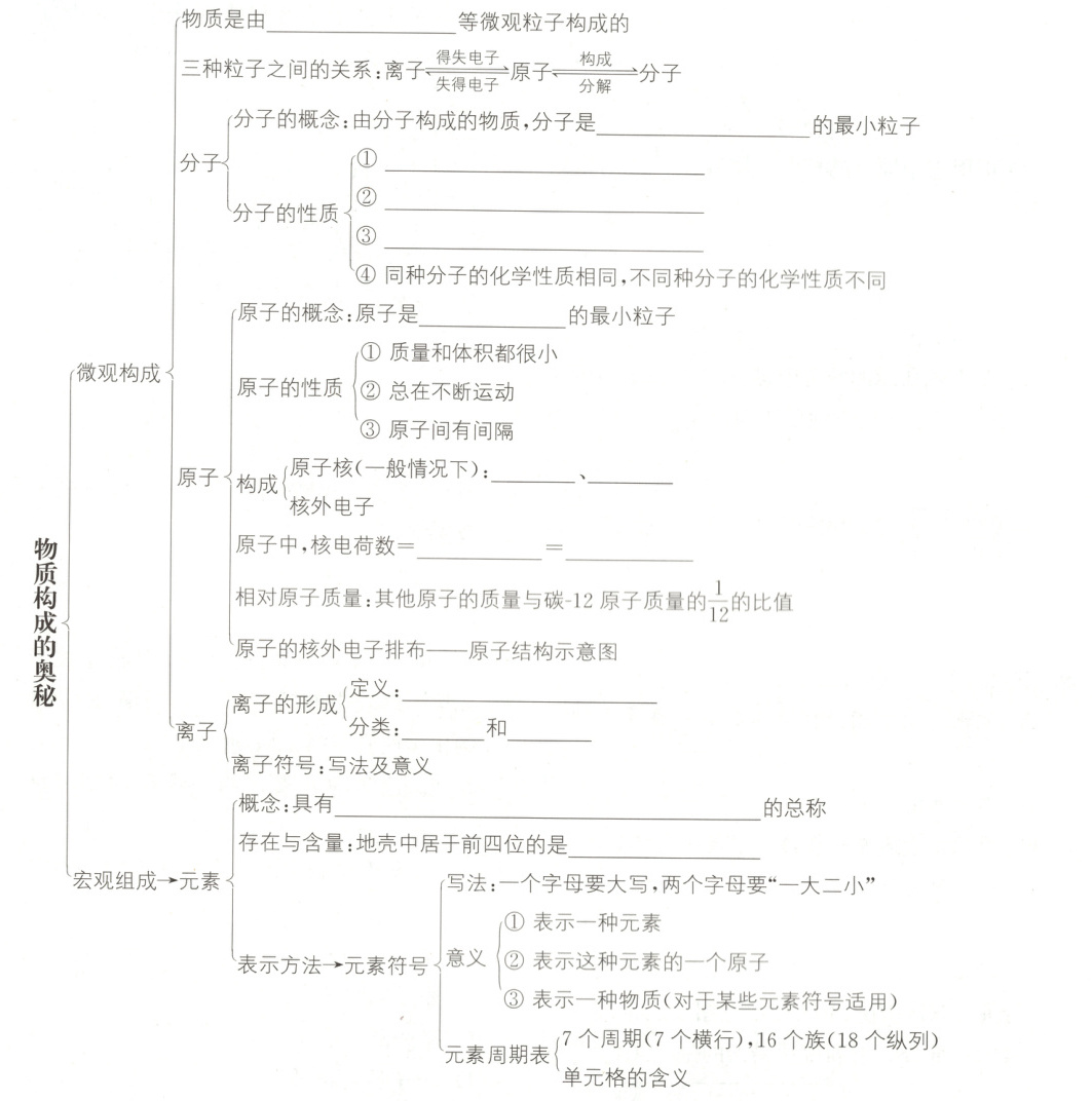 分子、原子、离子 保持物质化学性质 ①质量和体积都很小 ②总在不断运动 ③分子间有间隔 化学变化中 质子 中子 核内质子数 核外电子数 带电的原子(或原子团) 阳离子 阴离子 相同核电荷数(或核内质子数)的一类原子 氧、硅、铝、铁