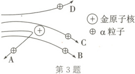 (1) 19世纪末,汤姆孙分析了高压放电管的阴极射线,发现了原子中含有电子,打破了原子是实心球体的说法,他认为原子里充斥着正电荷,带负电荷的电子像葡萄干一样镶嵌在其中。1909年,物理学家卢瑟福用一束带正电的、质量比电子大得多的高速α粒子轰击金箔,预测这些α粒子会毫不费力地击穿金原子,到达对面的探测板上,结果发现绝大多数α粒子穿过金箔后仍保持原来的运动方向,少数α粒子发生了较大角度的偏转,极少数α粒子被反弹回来。