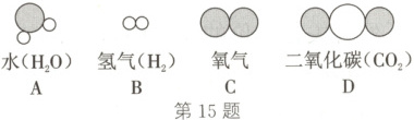 15. 如图为部分物质的分子模型和化学符号(化学式)。结合所学化学知识,回答下列问题:
