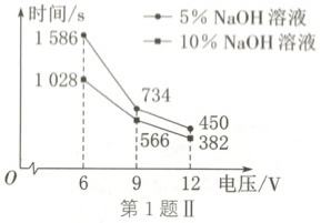 (7)电解纯水速率较慢,实验时常在水中加入 NaOH 增强导电性,NaOH 本身不参与反应。为探究不同电压和不同浓度 NaOH 溶液对电解水速率的影响,小组同学进行多次实验,测得不同条件下产生 20 mL 氢气所需时间如图Ⅱ所示。由图Ⅱ可知,上述实验中,电解水速率最快的条件是 NaOH 溶液浓度为