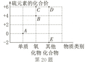 20. A 解析:A点对应的物质为硫单质,硫在空气中燃烧产生淡蓝色火焰,A符合题意;C点对应的物质为氧化物,且硫元素的化合价为+6,根据化学式书写原则及化合物中各元素正负化合价代数和为零可知,其化学式为SO₃,而硫燃烧的生成物为SO₂,B不符合题意;B点对应的物质为氧化物,且硫元素的化合价为+4,根据化学式书写原则及化合物中各元素正负化合价代数和为零可知,其化学式为SO₂,C点对应物质为SO₃,由分子构成的物质,分子是保持其化学性质的最小粒子,SO₂是由二氧化硫分子构成的,SO₃是由三氧化硫分子构成的,虽然组成它们的元素相同,但构成它们的分子不同,二者化学性质不相同,C不符合题意;在H₂SO₃中,氢元素的化合价为+1,氧元素的化合价为-2,设硫元素的化合价为x,根据化合物中各元素正负化合价代数和为零可得,(+1)×2+x+(-2)×3=0,解得x=+4,而D点对应物质中硫元素的化合价为+6,因此D点对应的物质化学式不可能是H₂SO₃,D不符合题意。
