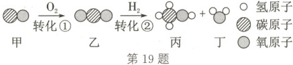 19. D 解析:转化①是一氧化碳和氧气反应生成二氧化碳,该反应符合“多变一”的特征,属于化合反应,A正确;乙为CO₂,氧元素显-2价,根据在化合物中各元素正负化合价代数和为0,则碳元素显+4价,丙为CH₃OH,氧元素显-2价,氢元素显+1价,设碳元素的化合价为x,则有x+(+1)×4+(-2)=0,解得x=-2,故乙、丙中碳元素的化合价不同,B正确;氧化物是只含有两种元素且其中一种元素是氧元素的化合物,整个转化过程中共有一氧化碳、二氧化碳、水3种氧化物,C正确;甲、乙、丙分别是CO、CO₂、CH₃OH,它们的1个分子中均含有1个碳原子,三种物质相对分子质量由小到大的顺序是CO、CH₃OH、CO₂,甲、乙、丙中碳元素的质量分数由大到小的顺序是CO、CH₃OH、CO₂,D错误。