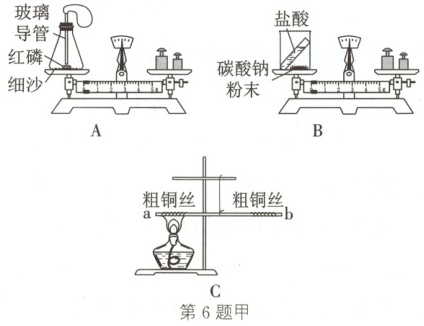 (3)实验C中,在一根用细铜丝吊着的长玻璃棒两端分别绕上等长的粗铜丝,并使玻璃棒保持水平,用酒精灯给a端铜丝加热1~2min。铜和氧气在加热的条件下反应生成氧化铜,根据质量守恒定律,化学反应前后物质的总质量不变,则生成氧化铜的质量等于参加反应的铜的质量与参加反应的氧气的质量之和,反应后a端质量增加,故冷却后,观察到a端铜丝表面变黑,a端下降,b端上升。